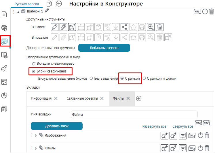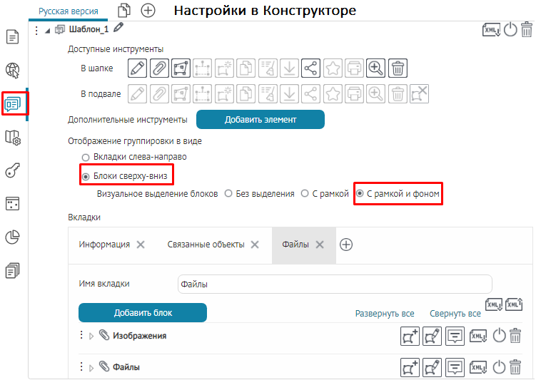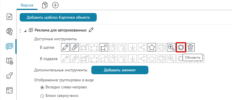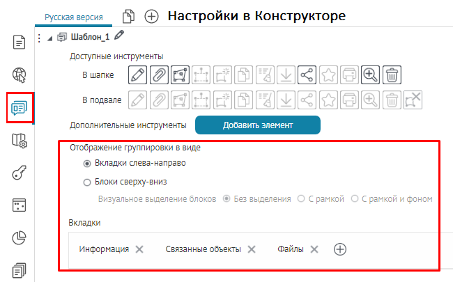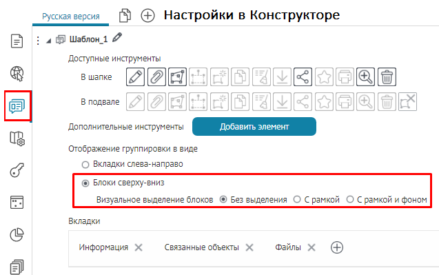 вкладок, блоков или кнопок вызова инструментов, назначьте текущий шаблон
