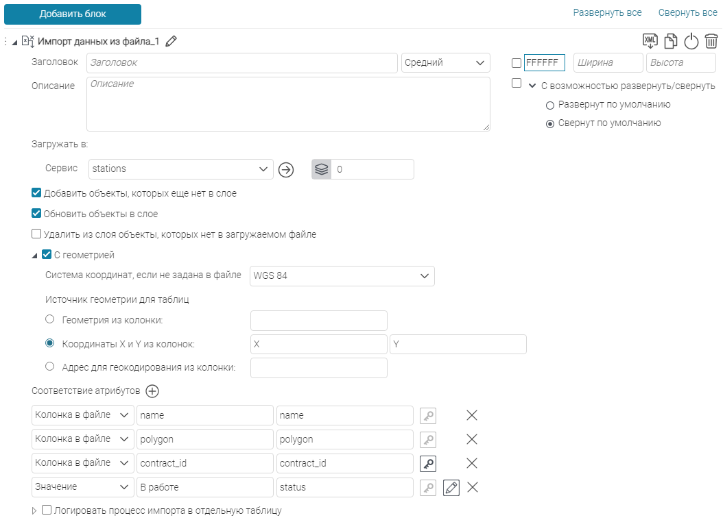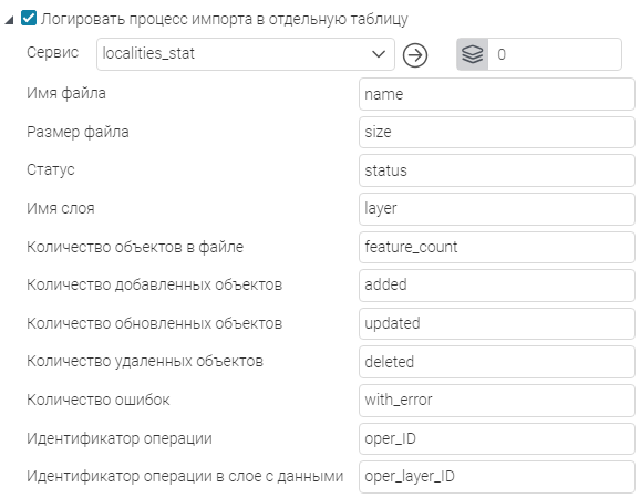). Для этого укажите сервис и номер таблицы, в которую будет производиться логирование, и соответствующие поля таблицы для записи процесса импорта данных.