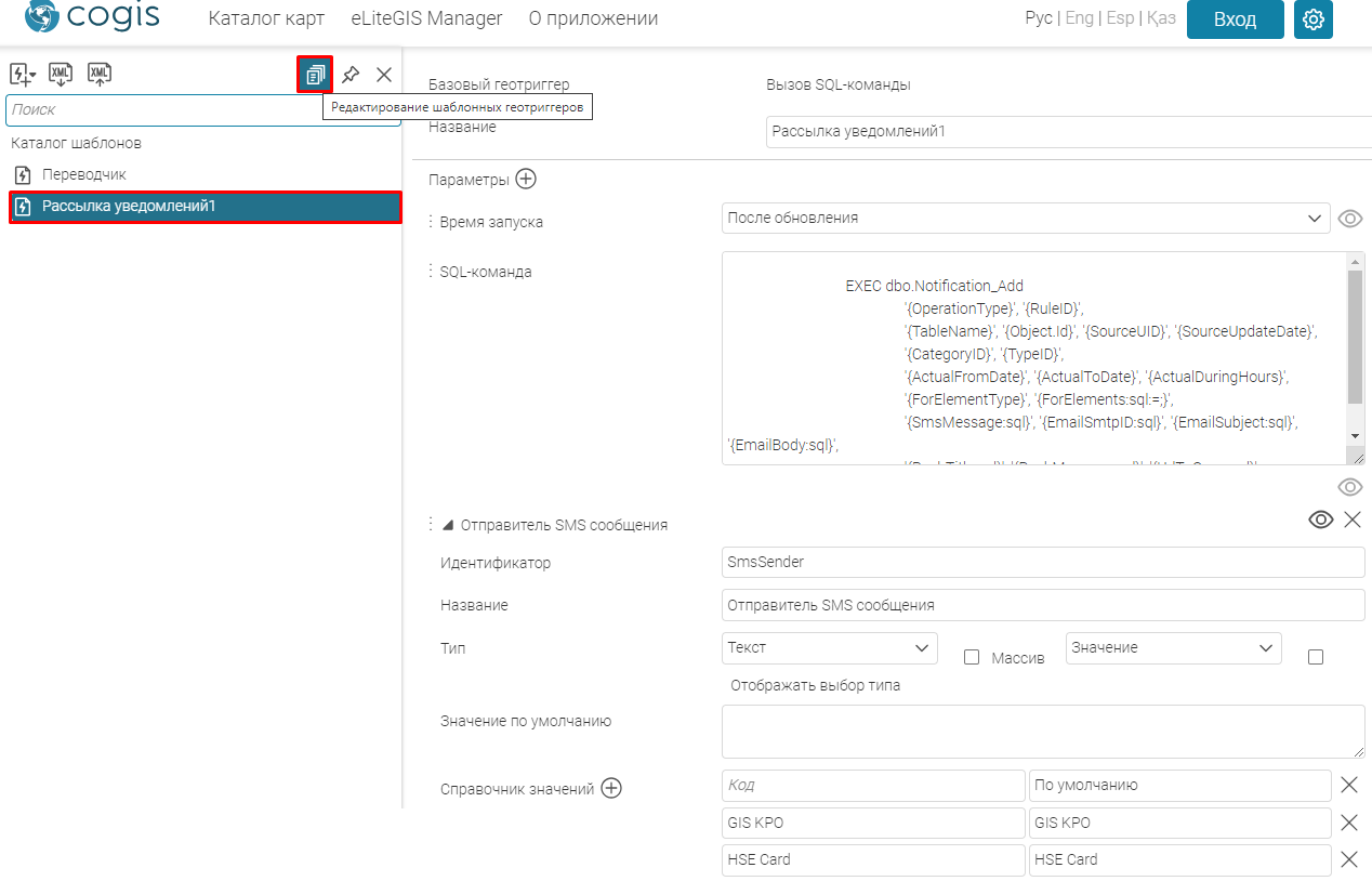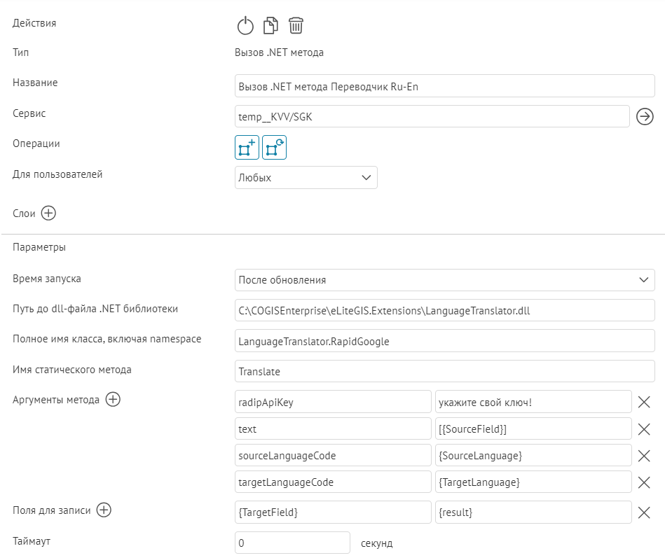 Например, этот геотриггер можно использовать для перевода текста с русского на английский язык, в этом случае при создании/обновлении объекта геотриггер автоматически сделает запись в указанном атрибутивном поле на английском языке.
