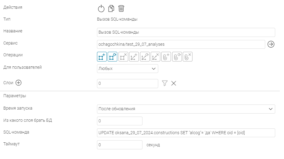 позволяет выполнить SQL-команду, используя контекст текущего объекта в процессе редактирования при создании/обновлении/удалении объекта, исходя из настроек плагина редактирования. Например, при вызове SQL-процедуры добавить записи изменений в лог-таблицу. С помощью геотриггера