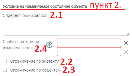 Рисунок 610 - Настройка ограничения Условие на изменяемое состояние объекта к опциям: Определяющий запрос, Ограничение по экстенту, Ограничение по объектам и Срабатывать, если изменены поля