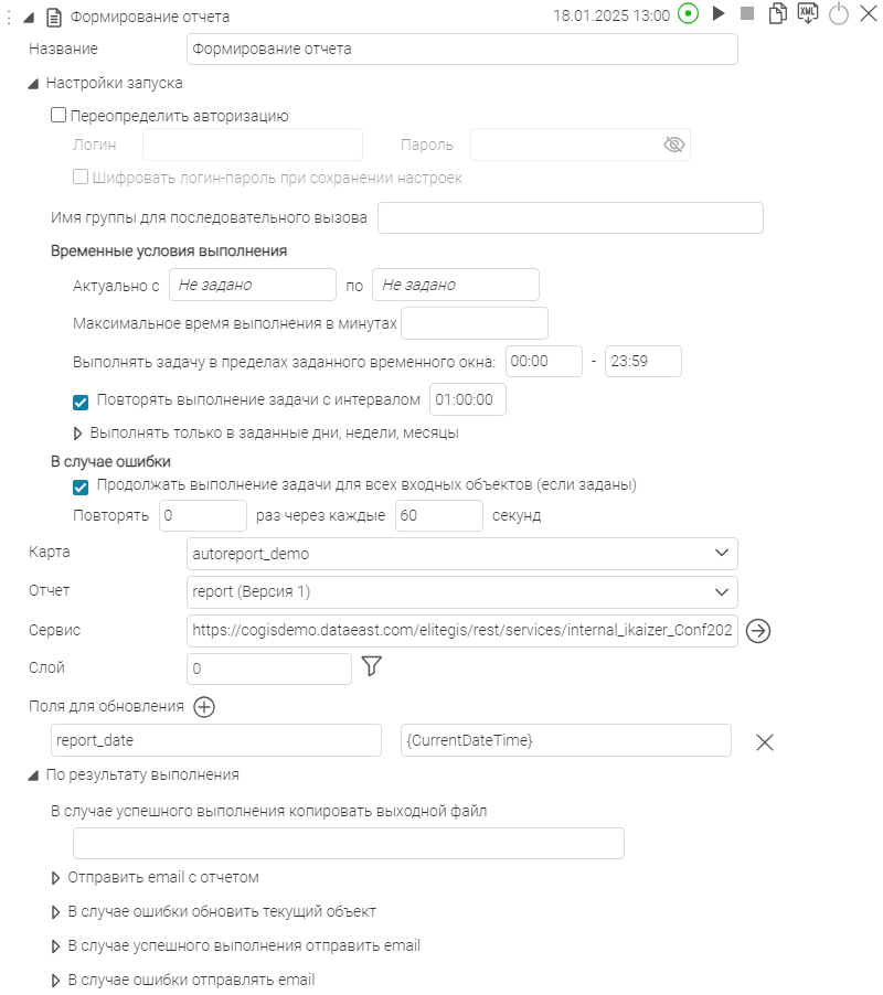 - обновление атрибутов текущего объекта в случае возникновения ошибки при выполнении задачи по формированию отчета (параметр В случае ошибки обновить текущий объект ). Опция доступна при формировании отчетов по объектам слоя выбранного картографического сервиса (для задачи заполнены параметры Сервис и Слой ).