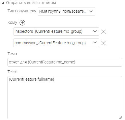 , добавьте строковое поле, в котором укажите корректный адрес электронной почты, логин пользователя или выберите из выпадающего списка нужную группу пользователей, согласно выбранному типу получателя. Можно добавлять несколько адресатов.