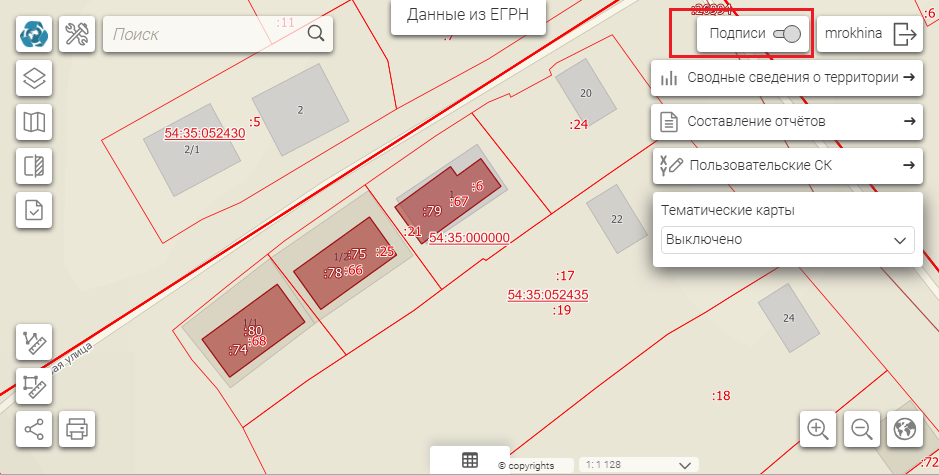 Подписи отображаются в центре части объектов, видимых в данном охвате карты, красным цветом с подчеркиванием. При этом: