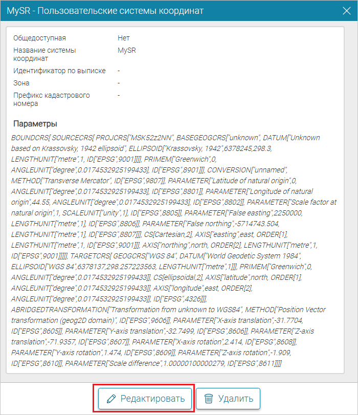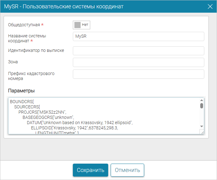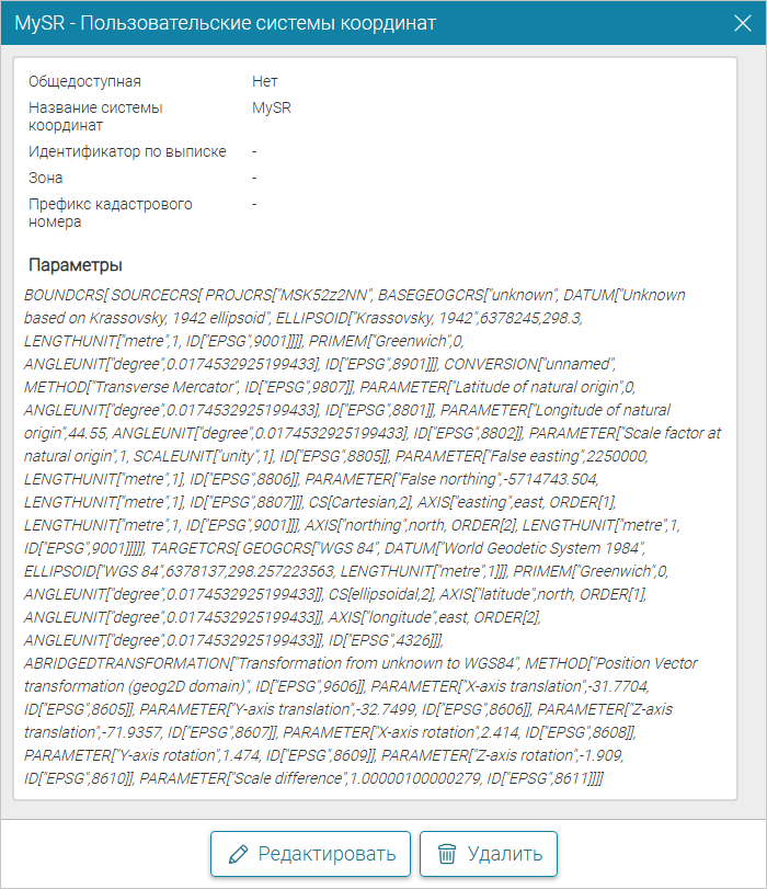 - параметры добавляемой координатной системы в формате WKT или proj.