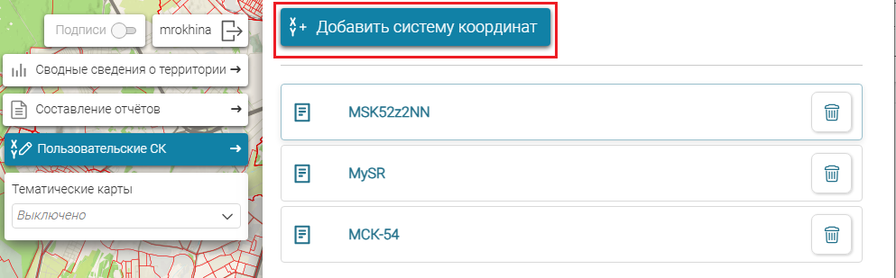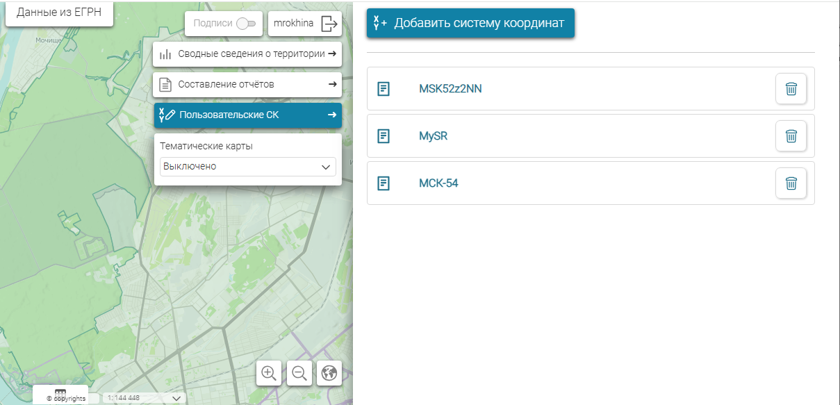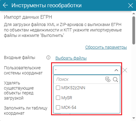 Рисунок 108 - Список пользовательских систем координат в инструменте Импорт данных ЕГРН