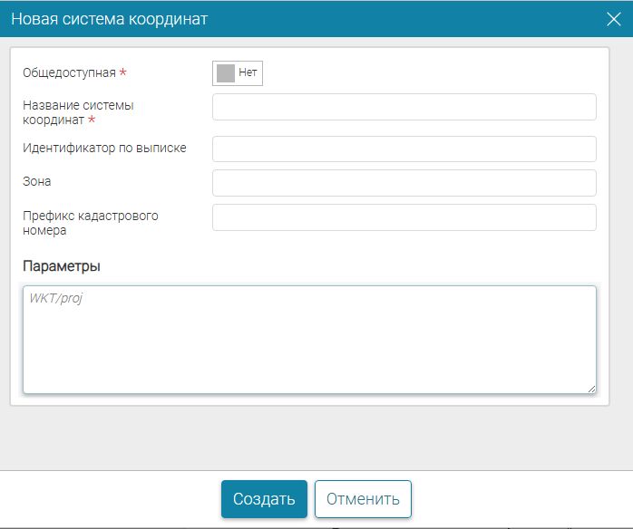 - Общедоступная - переключатель, определяющий уровень доступа к добавляемой системе координат: