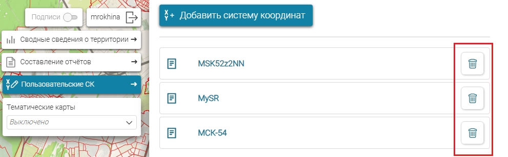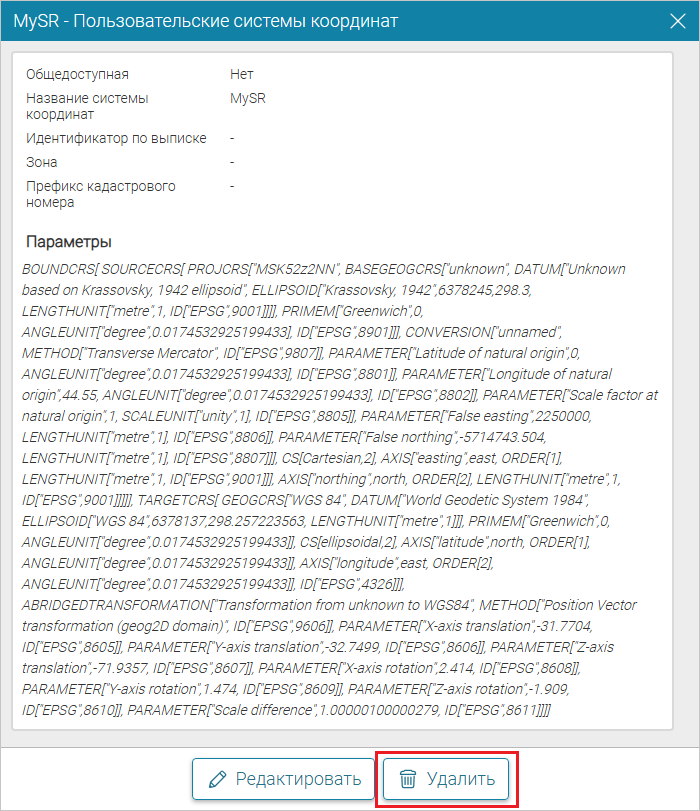 Чтобы удалить пользовательскую систему координат, для выбранной системы координат нажмите на кнопку