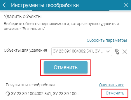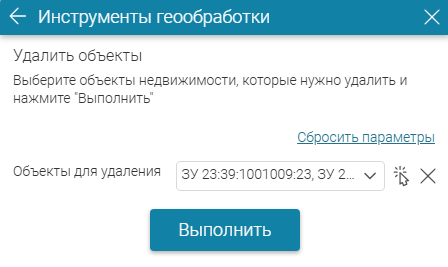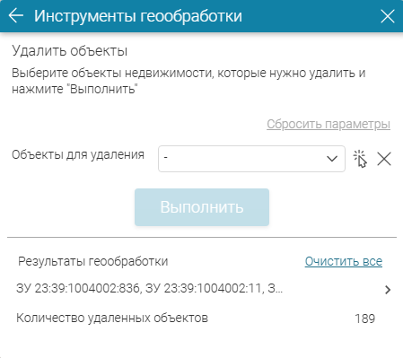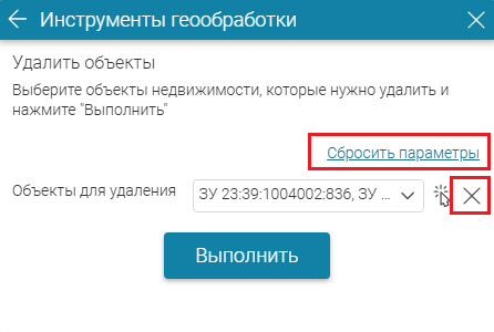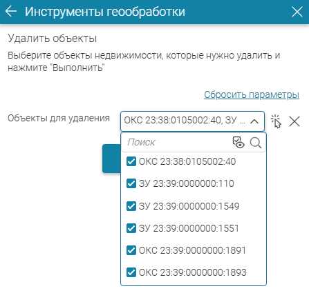 Выберите кадастровые номера объектов для удаления из выпадающего списка (параметр