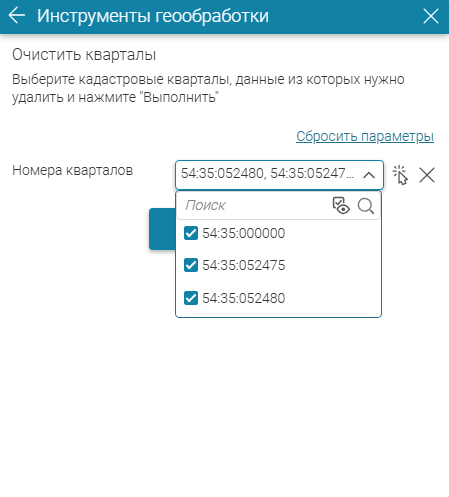 Выберите кадастровые номера кварталов, в пределах которых будут удалены все объекты, из выпадающего списка (параметр