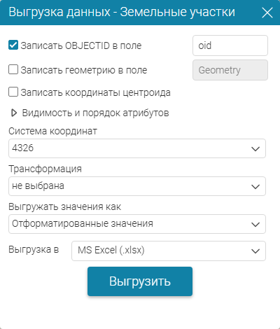 - геотрансформация, необходимая для корректного перепроецирования геометрии выгружаемых объектов, если система координат слоя с объектами не совпадает с установленной в предыдущем параметре;