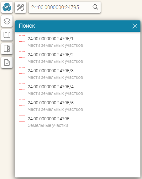 - поиск объектов недвижимости (ЗУ, ЧЗУ, ОКС, помещений, машино-мест) - по кадастровому номеру;