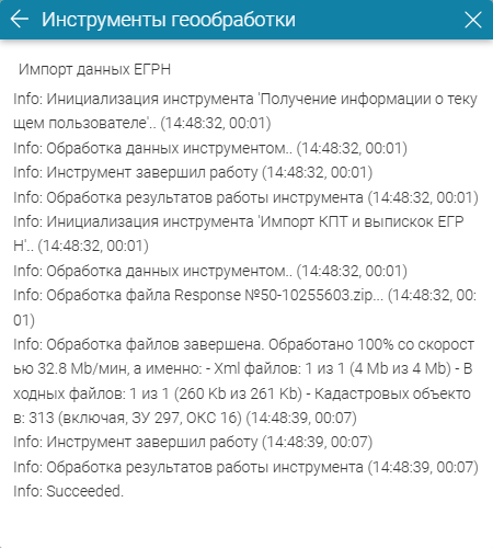 - Рисунок 212 - Просмотр информации о ходе обработки (на примере инструмента Импорт данных ЕГРН)
