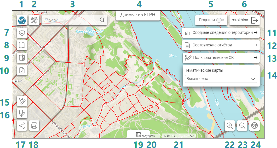 Тумблер используется для подписывания объектов карты в картографическом приложении Данные из ЕГРН (см. п. 2.10 ).