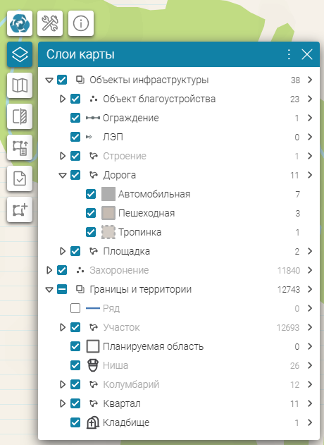 С помощью легенды слоев можно управлять видимостью объектов на карте, посмотреть символику объектов и количество объектов в каждом слое. Если слой не отображается на текущем масштабе, то он в легенде обозначен серым цветом, при изменении масштаба карты видимость слоев автоматически меняется, как и их отображение в легенде.