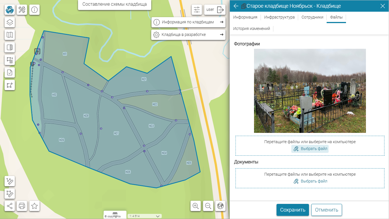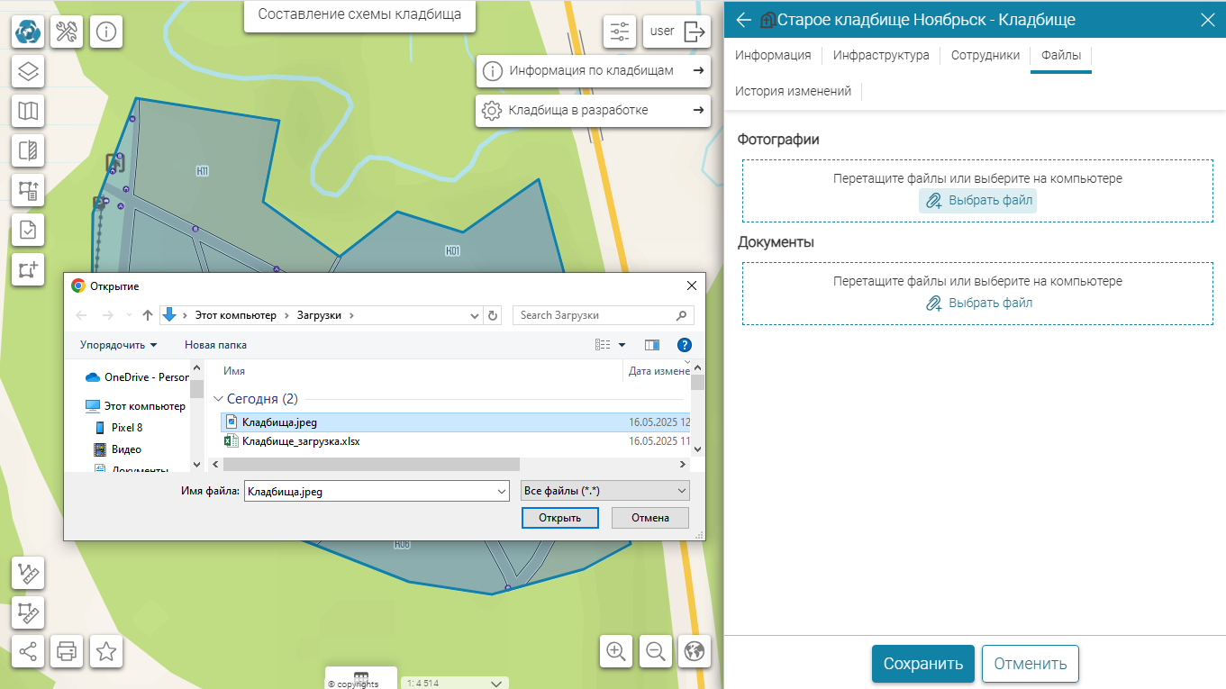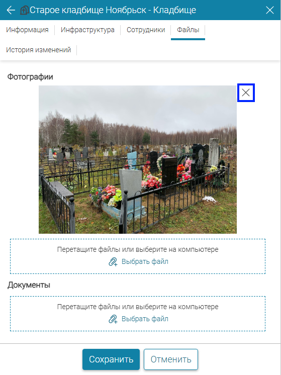 На вкладке «Файлы» отобразится добавленный файл. Чтобы прикрепить этот файл к кладбищу, нажмите «Сохранить».
