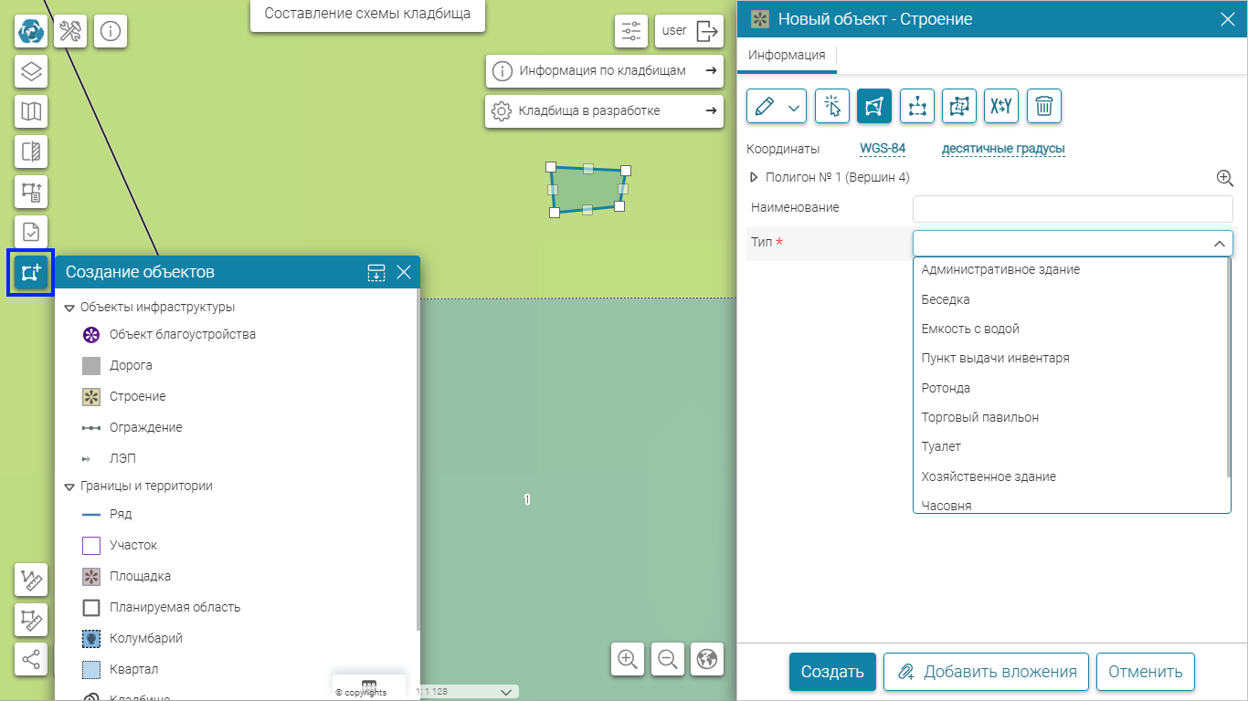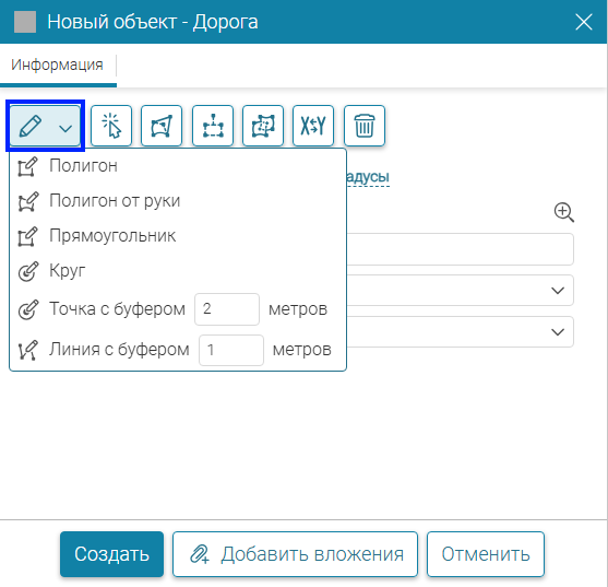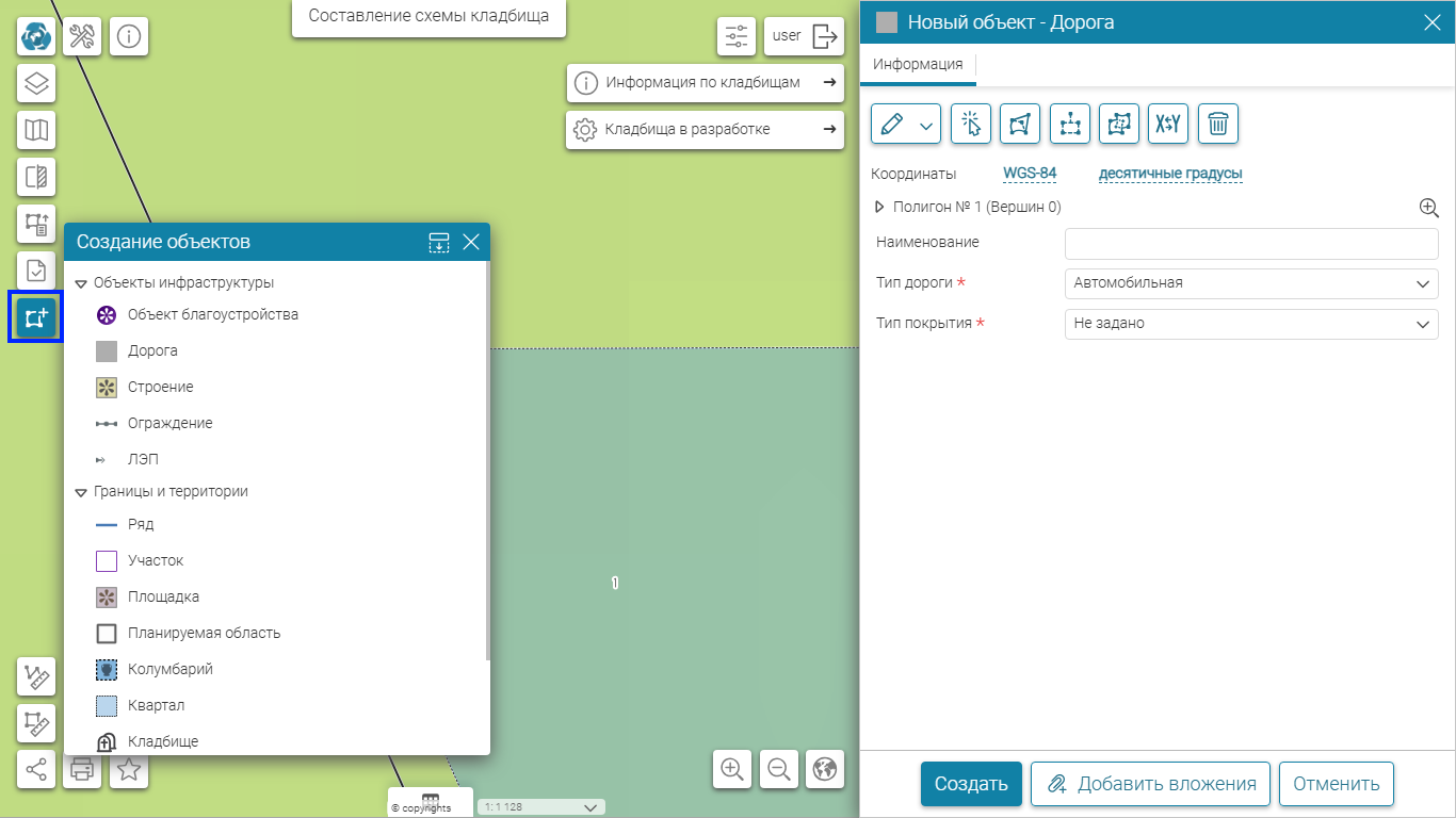 Чтобы создать любой объект, воспользуйтесь инструментом «Создание новых объектов». Выберите нужный объект и нарисуйте границы нового объекта. Выберите Тип объекта из предложенного списка и при необходимости введите наименование объекта и тип покрытия. Нажмите кнопку «Создать».