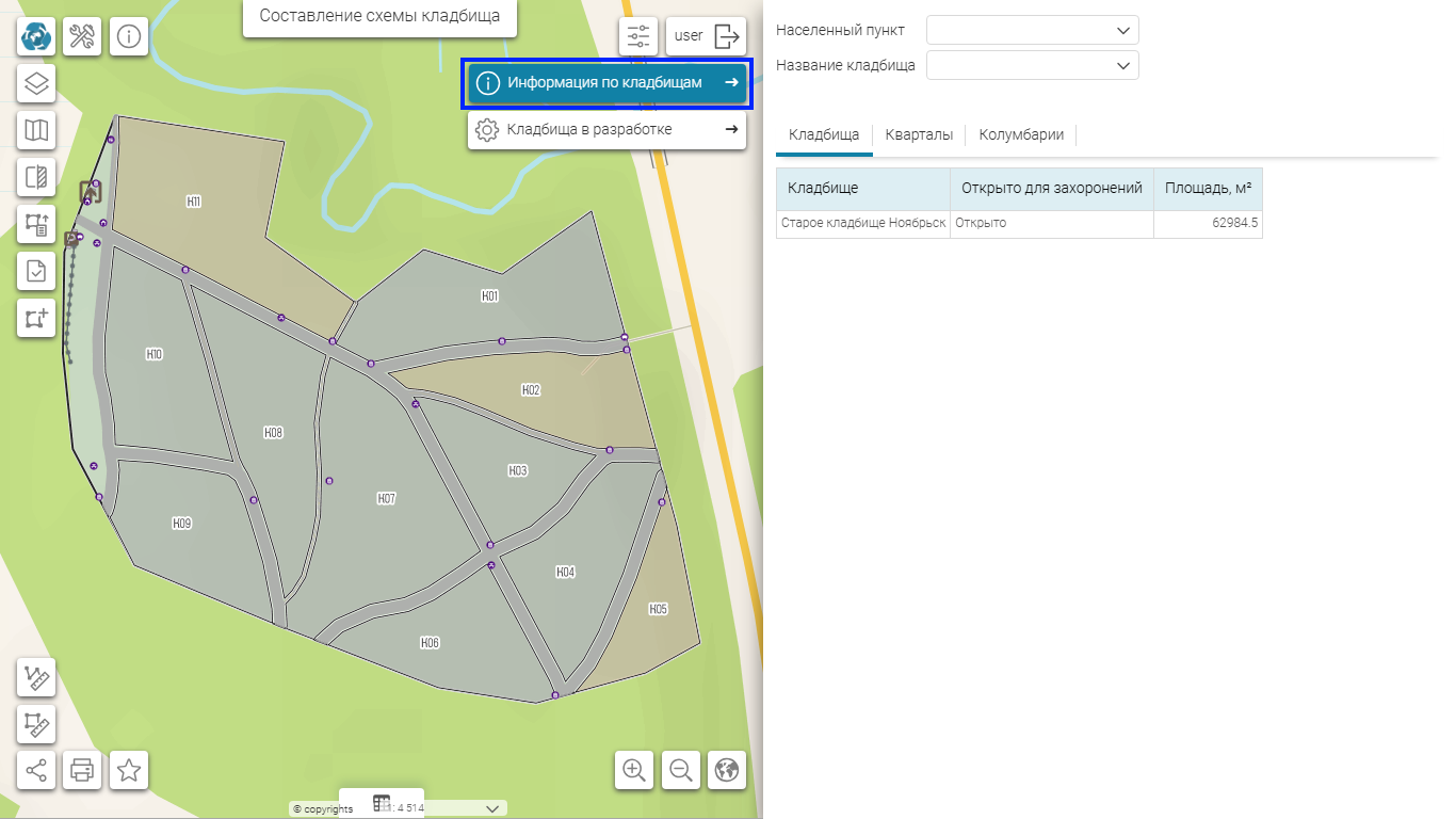 Чтобы перейти к карточке кладбища, кликните по кладбищу на карте или воспользуйтесь виджетом «Информация по кладбищам» и на вкладке «Кладбища» кликните по строке с нужным кладбищем (