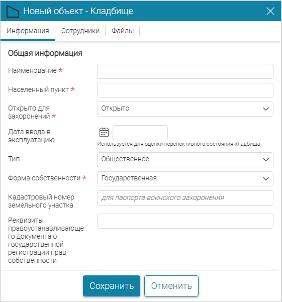 - Населенный пункт - указанный населенный пункт после сохранения кладбища появится в списке населенных пунктов в виджете «Информация по кладбищам».