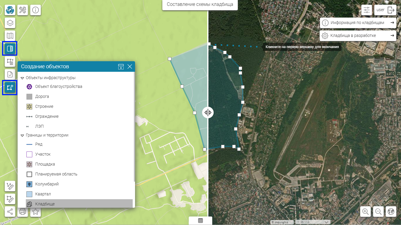 Чтобы создать новое кладбище, откройте веб-приложение «Составление схемы кладбища» и нажмите на кнопку «Создание новых объектов». В списке объектов выберите «Кладбища», на карте появится маркер для отрисовки границ, установите его в начальную точку и нарисуйте границы нового кладбища.