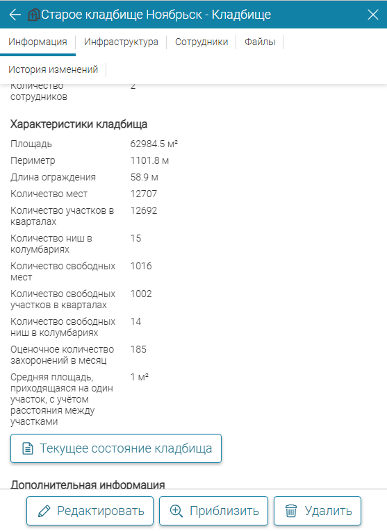 В карточке кладбища на вкладке «Информация» в блоке «Характеристики кладбища» отображается следующая информация:
