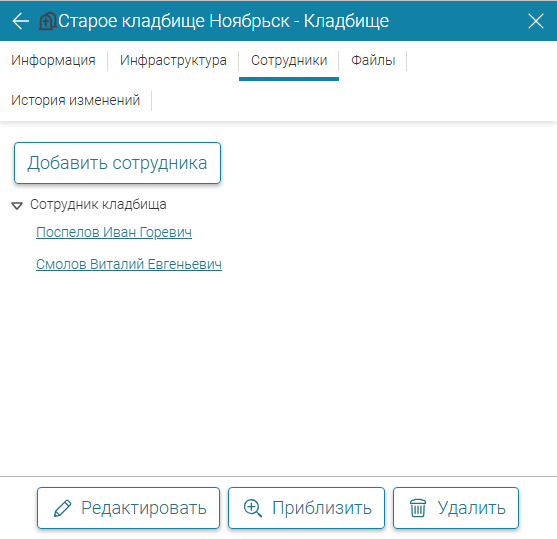 Список всех сотрудников кладбища находится в карточке кладбища на вкладке «Сотрудники». Чтобы перейти к карточке сотрудника кликните по интересующему вас сотруднику в этом списке (