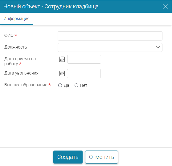 Для регистрации текущих захоронений указывается «ФИО землекопа». Чтобы добавить «ФИО землекопа», в выпадающем списке при регистрации захоронения добавьте нового сотрудника с должностью «Землекоп».