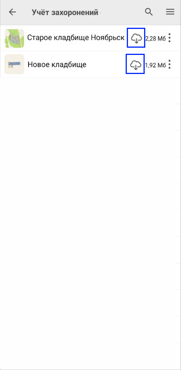 Мобильное приложение содержит две карты: «Учет захоронений» и «Составление схемы кладбища». В зависимости от прав доступа пользователь видит определенные карты, это сделано для того, например, чтобы сотрудник кладбища видел только карты своего кладбища. Перед началом работы скачайте нужную карту. Для этого убедитесь, что ваше устройство подключено к интернету, откройте мобильное приложение, скачайте карту кладбища и откройте ее (Важно!), чтобы в дальнейшем с ней можно было работать независимо от наличия интернета (