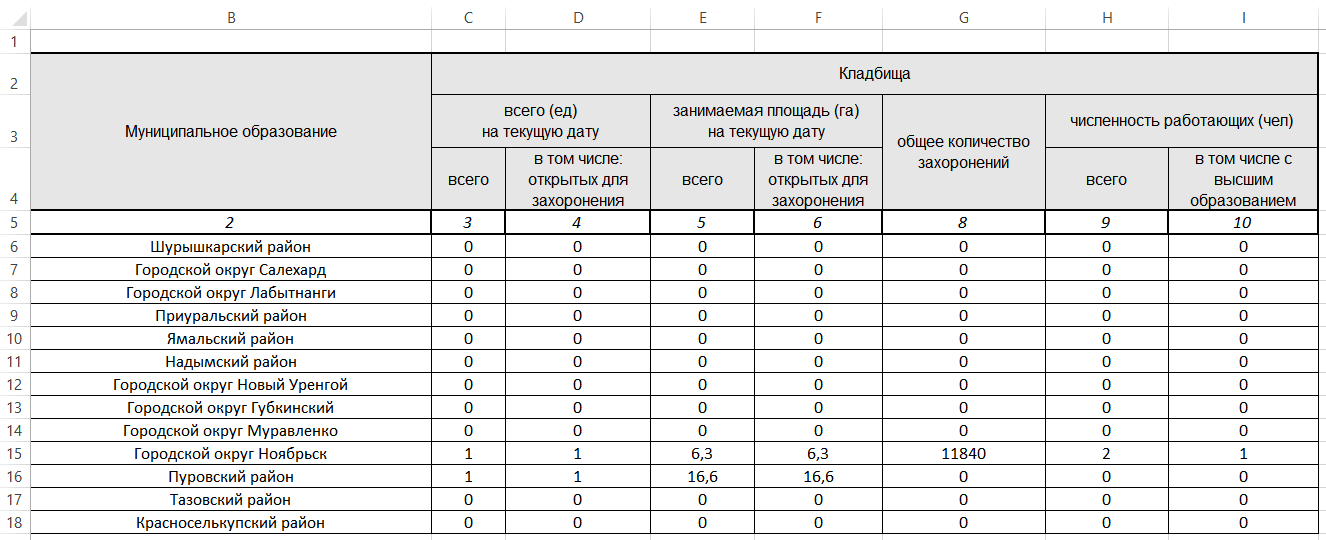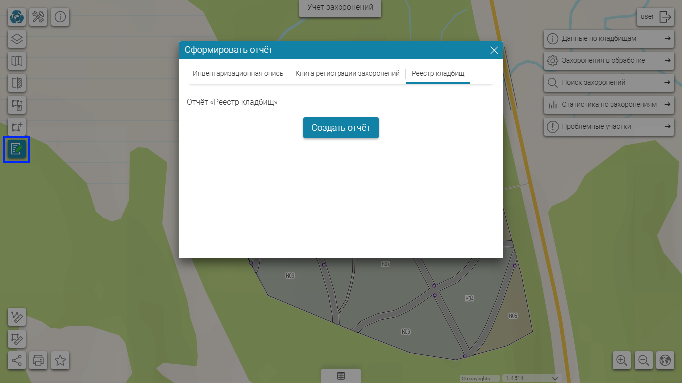 Для формирования отчета «Реестр кладбищ» нажмите на кнопку «Сформировать отчёт», перейдите во вкладку «Реестр кладбищ», выберите кладбище и укажите период, запустите инструмент формирования отчета. В отчет попадут все кладбища, существующие на текущую дату. Вид отчета представлен на